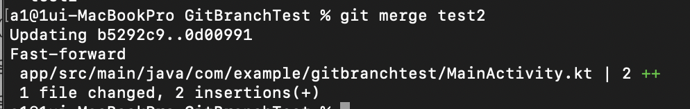 이렇게 하면 fast-forward 병합이 실행된다. 이번에는 test1 브랜치를 병합해 본다.