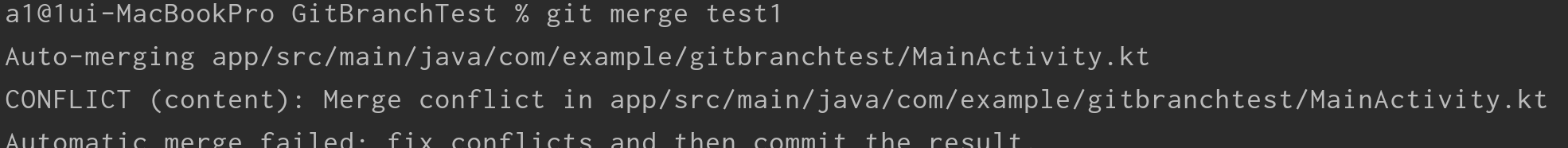 ex) test2 branch 10행에 a를 작성, test1 branch 10행에 b를 작성