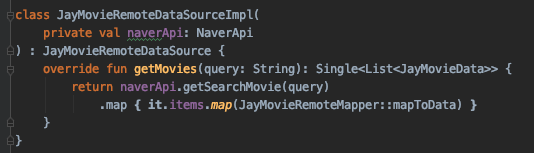 DataSource에 getMovies함수는 Single<List<JayMovieData>>를 반환한다. 여기서 JayMovieData는 local와 remote를 조합하는 공통 data model 이다. source의 구현체인 impl에서 api를 통해 받아온 데이터(List<NaverSearchResponse<MovieModel>>)를 mapper를 통해 data model에 맞게 가공해준다.