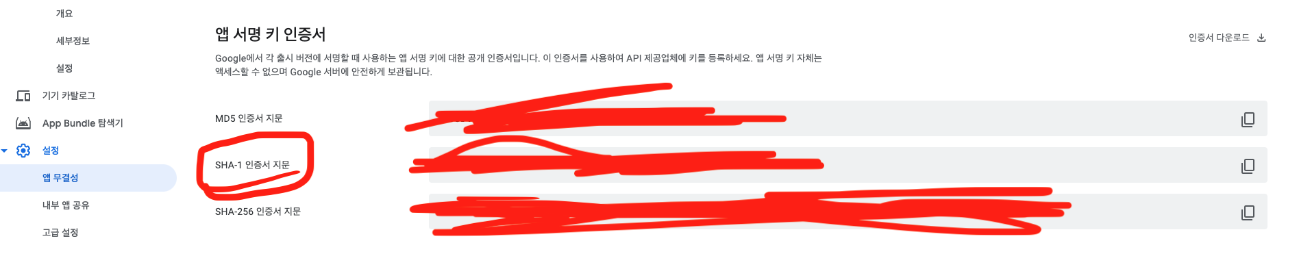 구글플레이콘솔 -> 앱 무결성 -> 앱 서명키 SHA-1 복사