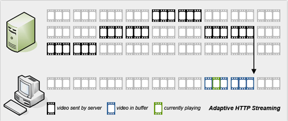 서버의 작은 조각 단위의 비디오를 가지고 스트리밍 하게 되며, 플레이어는 이 미디오 조각을 연속된 스트림으로 연결한다. 대중적인 사례는 애플의 HLS 이고 HLS 프로토콜은 표준으로 지정되었다.