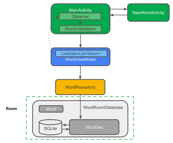 MainActivity : 리싸이클러뷰를 사용하여 단어를 목록에 표시하고, 메인액티비티가 정의한 뷰모델의 옵저버에 LiveData를 관찰하고 변경될 때 어댑터에 통지된다.