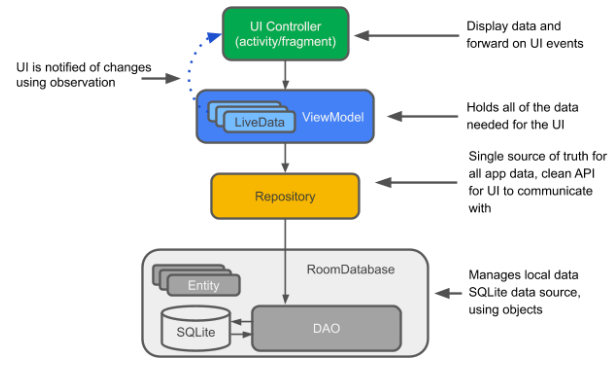DAO는 데이버 테이스가 아닌 저장소(레포지토리)의 생성자로 전달된다. DAO에는 데이터베이스에 대한 모든 읽기/쓰기 방법이 포함되어 있기 떄문에 DAO에만 액세스 해야 한다. 따라서 전체 데이터베이스를 저장소에 공개 할 필요가 없다. 데이터베이스의 데이터를 가져오면 LiveData가 이를 캐치해서 데이터가 변경되면 메인 스레드 관찰자에게 알려준다.